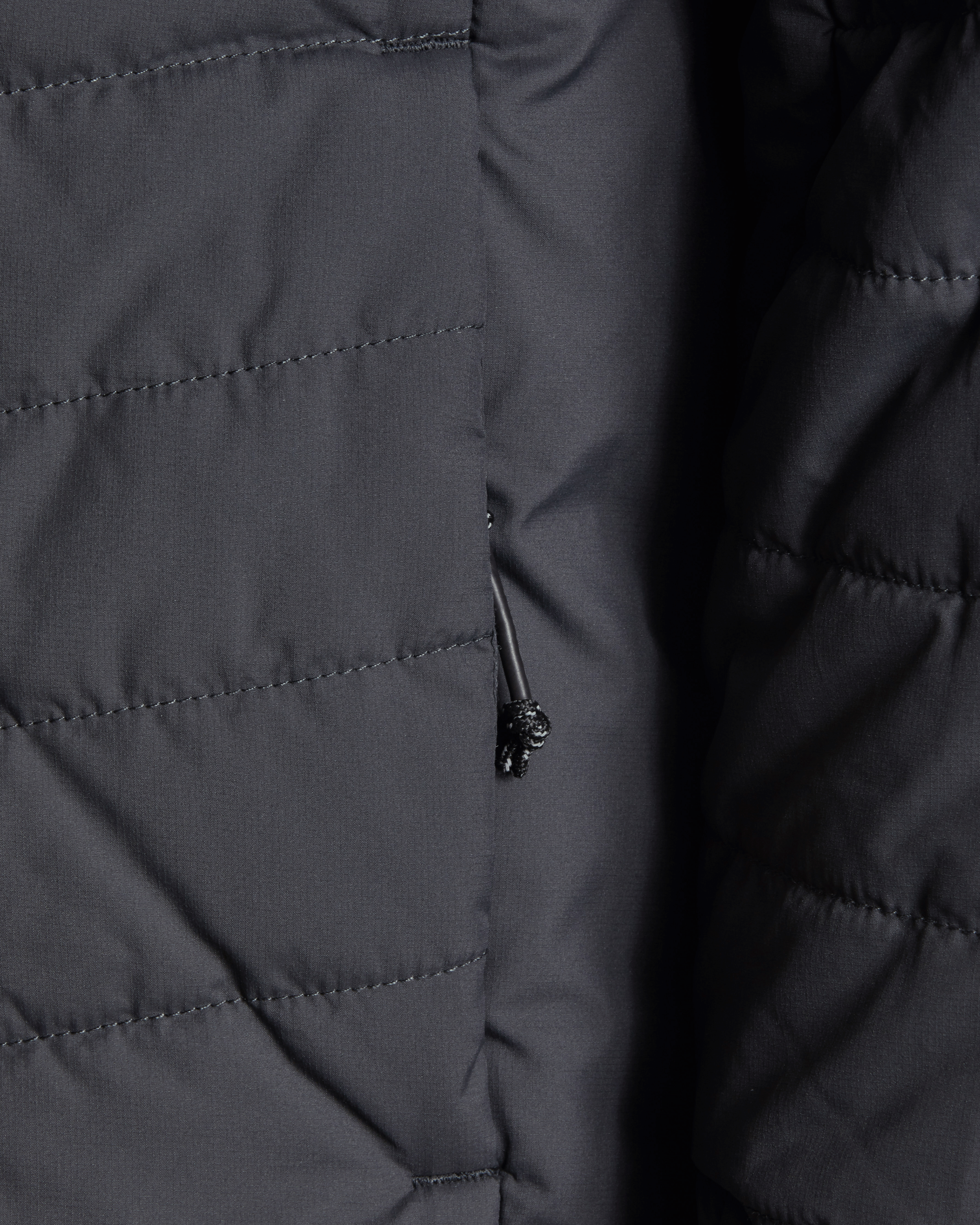 Quilt stitched ripstop polyester secures the down in place. Water resistant treatment blocks moisture, and it has ability to pack away in its left hand side pocket for compact storage in your pack.